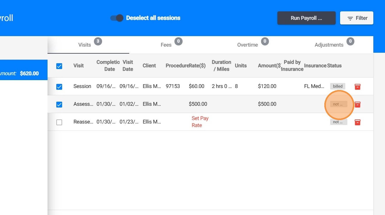 - Not Billed (No facturado): Una o más sesiones de observación aún están pendientes de facturación.