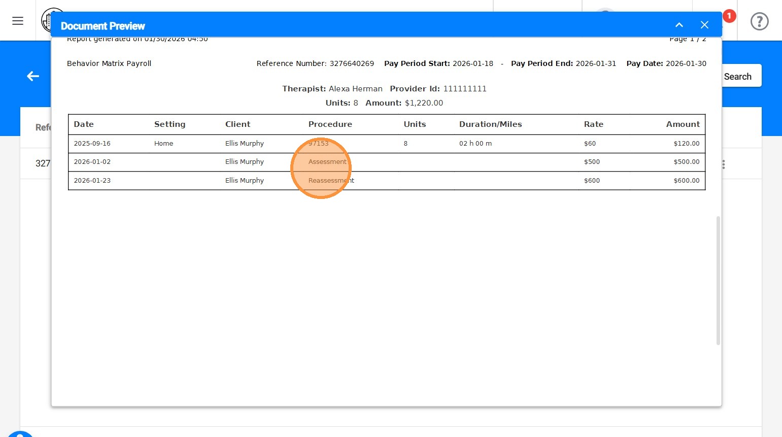 12. Después de que la nómina se procesa, los terapeutas también verán el reporte completado de evaluación o reevaluación reflejado en sus facturas.