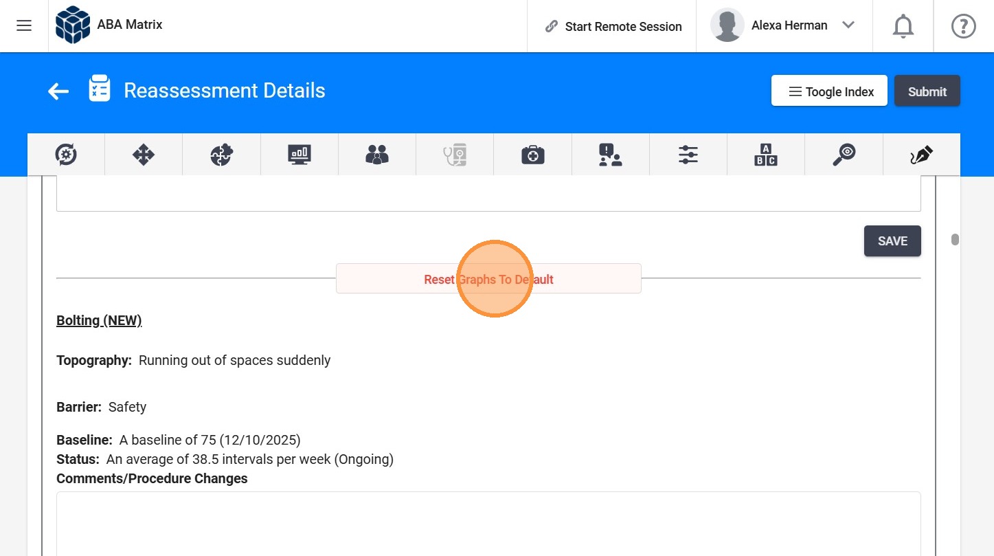 In Assessments and Reassessments, the system generates graphs based on the selected treatment period by default. However, you can add additional graphs with customized configurations for each behavior, replacement behavior, or skill to meet the needs of each case.